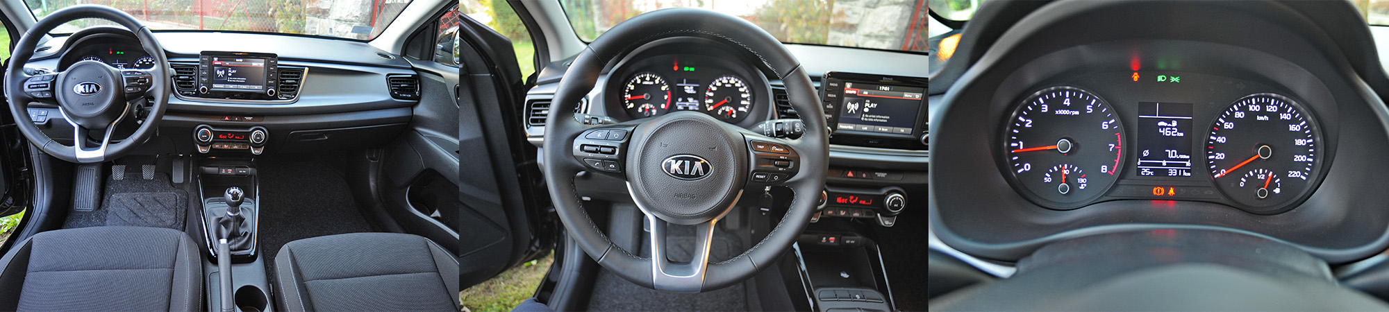 Kia Rio u EX Motion paketu opreme ima mnogo toga. Od upravljača sa komandama na sebi, preko multifunkcionalnog ekrana osetljivog na dodir od 7”, pa sve do onoga što uvek prija. Precizne završne obrade i materijala koji prijaju. Iako nema neku od aktuelnih digitalnih instrument tabli, i stara dobra analogija još uvek radi svoj posao ako je grafički dobro rešena, a ovde to jeste, uz relativno velik ekran putnog računara smešten između analognih instrumenata. Upravljanje funkcijama infotejmenta je intuitivno i jednostavno uz visoku rezoluciju ekrana i dobru čitljivost, što podjednako važi za navigacioni sistem i kameru za vožnju unazad. U osnovi, govorimo o veoma dobro zaokruženom paketu opreme, koji nije rasipan, ali je potpun.