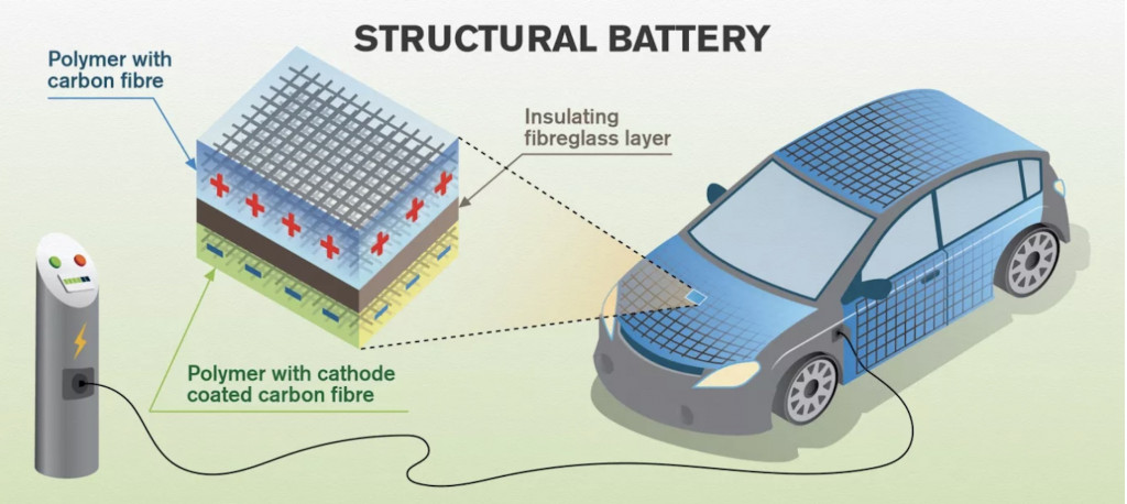 Električna vozila bi jednog dana mogla da skladište energiju u svoje karoserije izrađene od ugljeničnih vlakana, čime bi nestala potreba za teškim baterijama. Nedavno objavljeno istraživanje Tehnološkog univerziteta u Švedskoj, Chalmers, pokazuje da ugljenična vlakna mogu da vrše ulogu provodnika u litijum jonskoj bateriji. Ovo znači da bi automobil mogla da karakteriše strukturalna baterija, umesto tradicionalne baterije. Prednosti smanjene težine i kilometara po punjenju su ogromne. Istraživači su testirali razne tipove materijala od ugljeničnih vlakana i utvrdili da ugljenična vlakna sa malim i loše orijentisanim kristalima imaju vrlo dobra elektrohemijska svojstva – materijal deluje kao provodnik u litijum jonskoj bateriji. Međutim, vrlo kruta ugljenična vlakna, sa visoko orijentisanim kristalima, imaju vrlo loša elektrohemijska svojstva. Leif Asp, profesor sa Tehnološkog univerziteta Chalmers, tvrdi da manja krutoća nije problem za automobile jer ugljenična vlakna sa dobrim elektrohemijskim svojstvima i dalje pružaju malo veću čvrstoću nego čelik. Tip ugljeničnih vlakana sa lošim elektrohemijskim svojstvima je duplo krući od tradicionalnog čelika. Ugljenična vlakna su već vrlo poštovan materijal u auto industriji, zbog svoje male težine i visoke krutoće. Elektrohemijska svojstva ovog materijala samo dodatno otvaraju mnoštvo mogućnosti za elektro automobile budućnosti. Asp je naveo da bi karoserija automobila takođe mogla skladištiti kinetičku energiju za senzore i ostale provodnike. On veruje da bi sve ove funkcije mogle spustiti ukupnu težinu automobila do 50%. Istraživački tim univerziteta je započeo saradnju sa auto i avio industrijama kako bi dalje optimizovali ugljenična vlakna za vozila. Ovaj pronalazak bi mogao doneti još veću korist avionima. Avioni današnjice su preteški da bi ih pokretala energija iz baterija, ali bi to strukturalne baterije mogle da promene jednog dana.