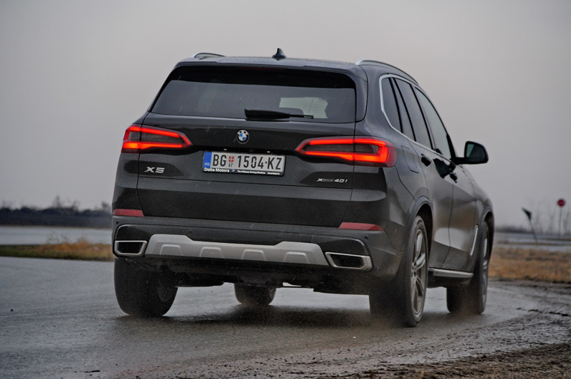 BMW nije podlegao trendu „razvlačenja“ zadnjih svetala preko celih prtljažnih vrata, pa je X5 dobio relativno klasična zadnja svetla. U celom vizuelnom utisku jedino što je teško shvatljivo su otvori izduvnih cevi na zadnjem odbojniku. Sve je savršeno uklopljeno uključujući i davno ustanovljene hromirane ukrase oko kraja izduvnih cevi, koje su često i lažne, ali na benzinskoj verziji u tim lepim hromiranim otvorima previše upadljivo „vire“ stvarne i nimalo atraktivne cevi izduva. To sigurno može elegantnije da se reši. Isto tako, opcione aluminijumske pragove nikako ne preporučujemo. Ne umanjuju prljanje bokova vozila, a pri svakom ulasku ili izlasku, pantalonama ćete ih uredno obrisati.