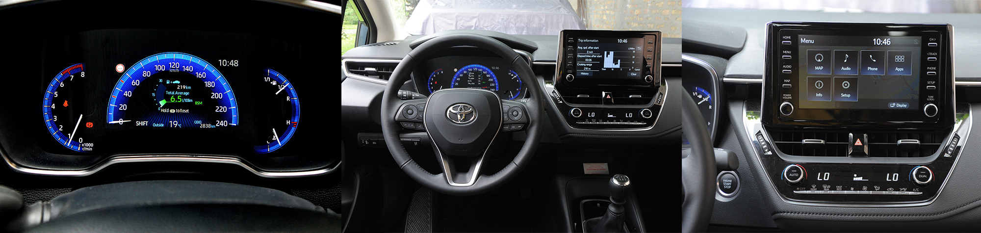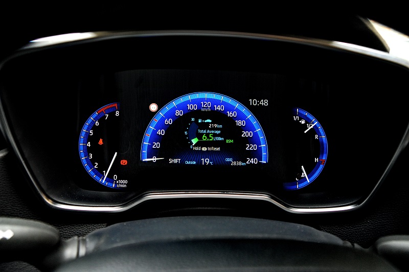 Ono čime će Corolla obradovati kupce je oprema, koja već u baznom paketu donosi digitalnu instrument tablu i često hvaljeni Toyota Safety Sense paket bezbednosnih asistencija. Tačnije instrumetacija je kombinacija dosta velikog centralnog TFT ekrana u boji od 4.2 ili 7” (od drugog Luna paketa opreme) i dva analogna instrumenta – obrtomera i pokazvača količne goriva. Dobra rezolucija i pregledna grafika savršeno rade svoj posao, ali nema preteranih opcija promene grafike prikaza, što i nije neka velika mana.