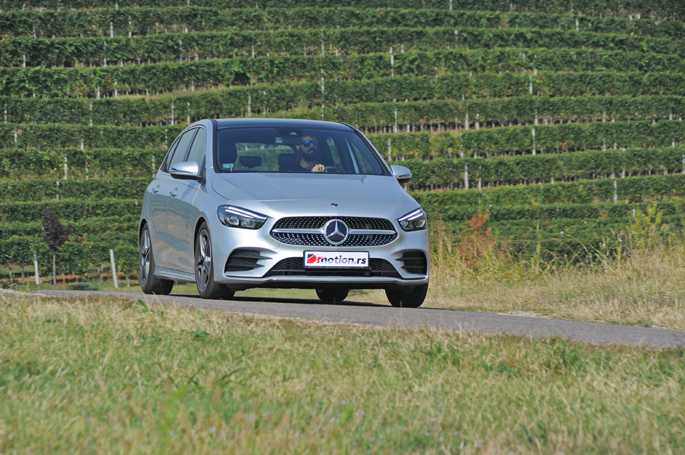 Za AMG paket opreme po pravilu se vezuju naplatci, upravljač i detalji na karoseriji i u enterijeru, ali u slučaju B Klase, AMG paket znači nešto mnogo važnije. Osim što je vozilo bliže zemlji, zadnja osovina je multilink tipa umesto jednostavnije torzije. Pored toga, test vozilo je došlo sa snažnijom verzijom 1.3 benzinskog četvorocilindraša, i sedmostepenim DCT menjačem. To znači da je prednjim točkovima na raspolaganju 161 KS i 250 Nm iz agregata zapremine 1.33 l, koji su zajednički razvili alijansa Renault Nissan i Mercedes Benz. Iako je nešto mekše trimovan od A Klase, pa samim tim bolje upija neravnine, B Klasa se u krivinama ne naginje kao što bi se moglo očekivati. Iako je upravljanje precizno, nije direktno i odlučno u poređenju sa istim modelom A Klase. Ova kombinacija je potpuno razumljiva u odnosu na potpuno drugačiju populaciju kupaca B Klase u odnosu na A Klasu. Kombinacija pogona i prenosa u B 200 čak i nadmašuje ono što bi se moglo očekivati od porodičnog MPV-a. Uz selektor modova vožnje upravljanje, odziv na gas i rad menjača sasvim lepo se prilagođavaju raspoloženju i putu, a za dodatni entuzijazam tu je promena stepena prenosa papučicama na upravljaču. Balans vozila je dobar, mada tendencije ka podupravljanju ili preupravljanju efikasno maskira “vredan” i efikasan ESP. Dosta uspravna i povišena pozicija sedenja donosi dobru preglednost iz vozila.