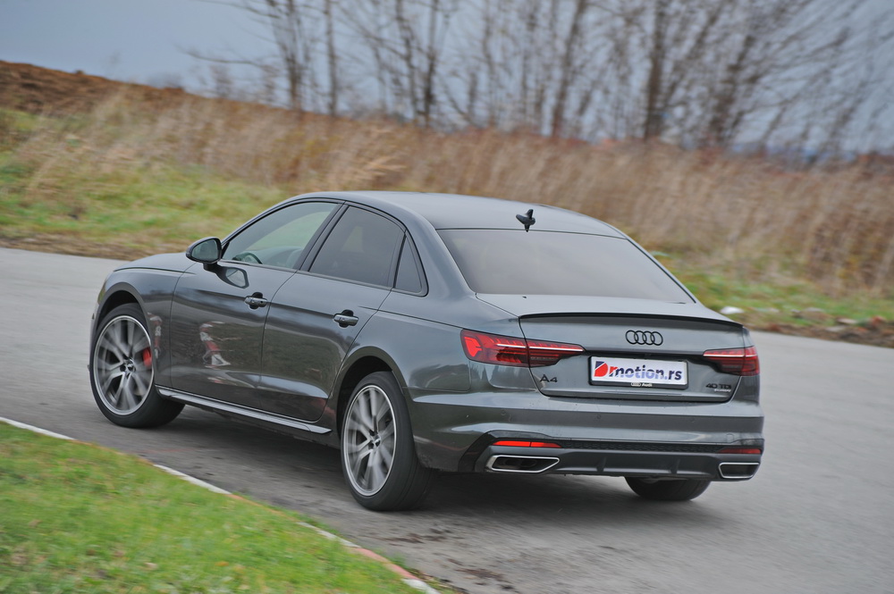 Ima li razloga da se A4 boji BMW-a Serije 3? Ne, nema. Da, postoji „istorijska“ vernost marki, postoje predrasude, postoje kalkulacije, ali A4 je limuzina odličnog balansa, koja kao i A6 vrhunski kombinuje udobnost i dinamičnost. U praksi to znači dosta tvrdo trimovano ogibljenje donosi gotovo zanemarljivo naginjanje u krivinama i promenu karaktera vozila pri snažnom dodavanju gasa ili oštrom kočenju, uz vrlo precizno i direktno upravljanje.