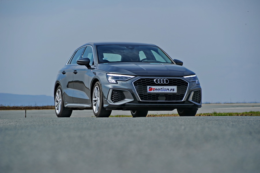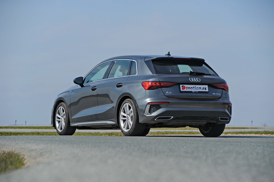 Samo, uprkos evidentnom manjku novina, Audi A3 izgleda odlično. Zapravo, u S-line paketu opreme, i relativno “normalna” 35 TFSI verzija deluje snažno i moćno. U poslu da svojim modelima podare stav, dizajneri Audija su pravi maheri. Sa svojih 4.34 metra dužine i milimetar ispod dva metra širine, ali i manje od 1.50 metara visine, novi Audi A3 je “mali pa nabijen” i deluje da puca od snage, pogotovo uz zapravo “namrgođen” gril hladnjaka. Međuosovinski razmak od 2.636 metra na pomenutu dužinu karoserije deluje velik uz kratke prepuste preko zadnjih točkova.