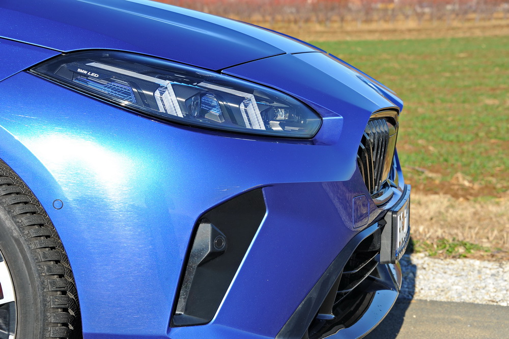 Gril hladnjaka je malo spušten i sada je ispod prednjih svetlosnih grupa, a više nema ni hromiranih obruga oko „bubrega“, što je posledica korišćenja ekološkijih materijala. Novina je i diskretna reljefna „jedinica“ u C stubu koji se u autoindustriji naziva Hofmeister trouglom. Naravno, na vizuelni utisak koji ostavlja testirani model utiče i činjenica da je bio u M Sport Pro paketu opreme, što znači spušten za 8 mm, na točkovima od 19“, ogromnim diskovima i crvenim kočionim čeljustima, itd. A tu je i poveliki zadnji spojler koji vizuelno značajno menja profil vozila.