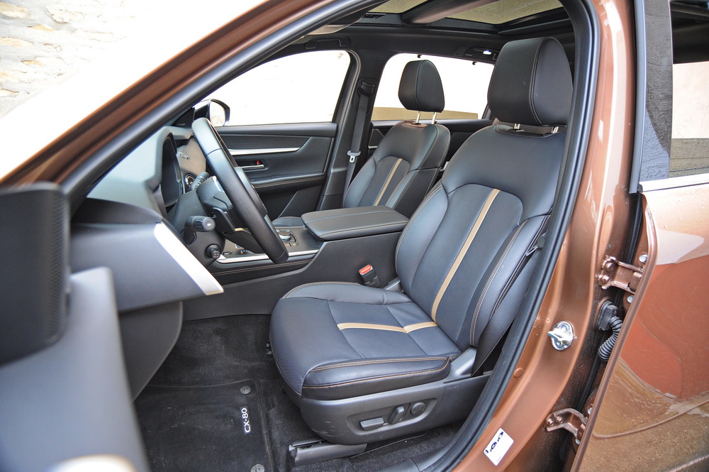 U slučaju Mazde CX-80 srednji red sedišta dobio je mogućnost uzdužnog pomeranja, podešavanja nagiba naslona, ali i njegovog potpunog preklapanja, ali ne svakog sedišta pojedinačno nego u odnosu 60:40. Srednja klupa je vrlo udobna i može se pohvaliti odličnom ponudom prostora.