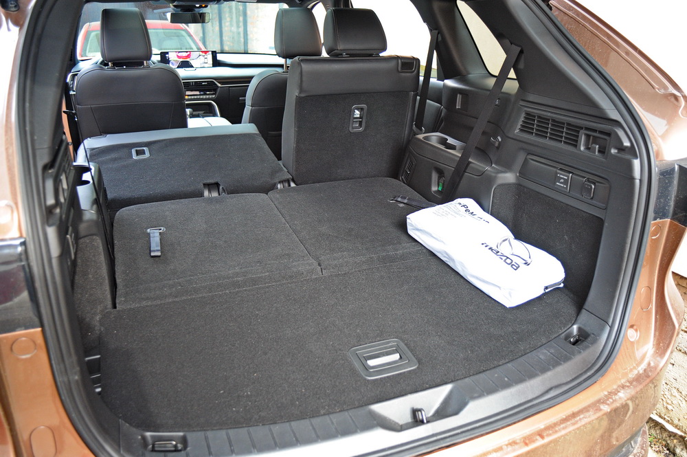 Zadnja dva sedišta, kada nisu u upotrebi, potpuno se „potapaju“ u pod prtljažnika, a tada je Mazda CX-80 petosed sa ogromnim prtljažnikom. Do visine prozora već je zapremine 687 litara, a preklapanjem naslona srednjeg reda raste na skoro 2.000 litara. Šta više, čak i kada su zadnja dva sedišta u upotrebi, preostaje upotrebljivih 258 litara. Vredi pohvaliti u činjenicu da je za pokrivač prtljažnog prostora predviđen prostor ispod poda prtljažnika, tako da se ne mora ostavljati van vozila.