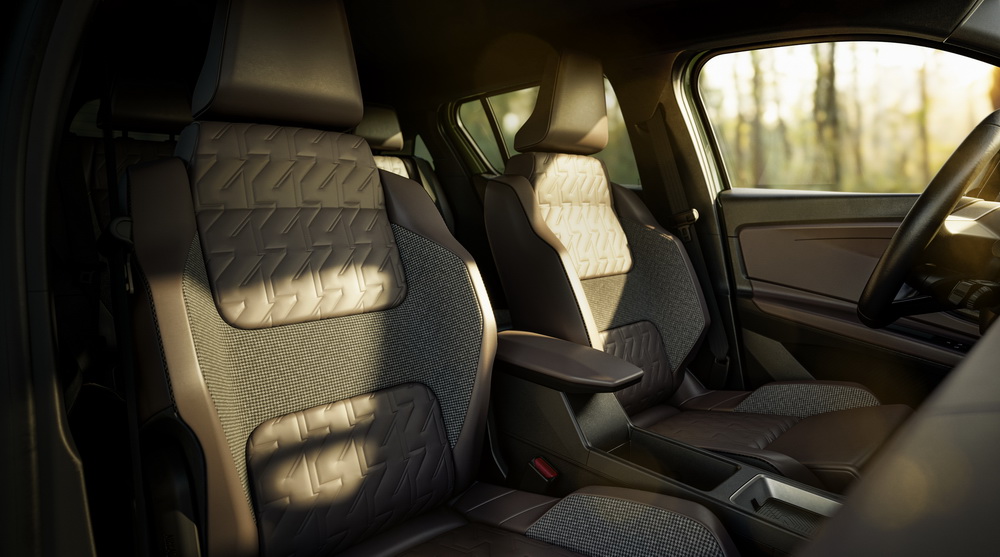 Enterijer ima sofisticirani dizajn, sa sedištima u tamno smeđoj rafiniranoj tekstilnoj (TEP) tkanini. Na vrhu naslona, prošiveni uzorak brojeva 4 u tonalnim nijansama dodaje grafički dodir. Uzorak „pečić“ pruža stilski završetak oblogama naslona i bočnim ojačanjima. Instrument tabla je takođe presvučena rafinisanim tekstilom u tamnobraon boji.