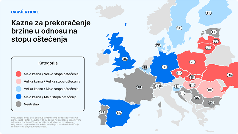 „Novčane kazne za prekoračenje brzine do 15 km/h u Evropi mogu se kretati od 10 do preko 200 evra. Iako u zemljama sa većim kaznama obično ima manje oštećenih vozila, treba uzeti u obzir i vozačku kulturu – tolerancija vozača prema kršenju saobraćajnih propisa znatno se razlikuje širom Evrope“, objašnjava Matas Buzelis, stručnjak za tržište automobila u kompaniji carVertical.