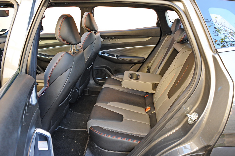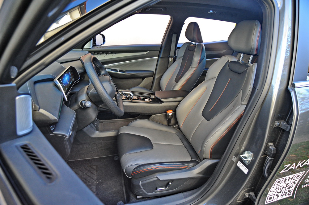 Da, govorimo o vrlo udobnim, izdašno dimenzionisanim prednjim elektropomičnim (veštačkom) kožom presvučenim sedištima sa grejačima, sa ekstremno dugim hodovima, pogotovo vozačevog. Precizno iskrojeno, precizno sašiveno i potpuno u službi udobnosti, čak vrlo lepo dizajnirano sa narandžastim akcentima.