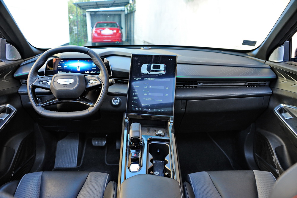 Da li se Geely ili ko god i gde god da je dizajnirao Cityray malo ugledao na Peugeot i pokušao da krene rešenjem koje Francuzi nazivaju I-Cockpit? Upravljač je praktično četvorougaon ili šestougaon ako bismo bili potpuno precizni, a iza njega je digitalna instrument tabla dijagonale 10.2“ koja je široka i relativno niska. Zbog čega pominjemo Peugeot? Pa zbog činjenice da smo stekli utisak da je ideja dizajnera bila da se instrument tabla gleda preko upravljača, a ne kroz upravljač, ali da je Geely Cityray dobio „mild“ verziju I-Cockpita.