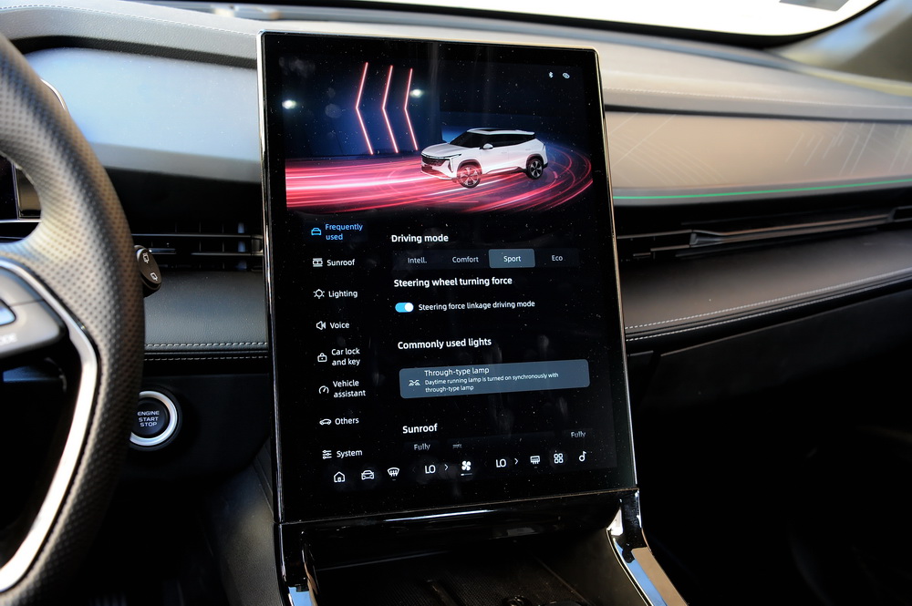 Klasičnih prekidača u modelu Geely Cityray nema. Sve komande su preko velikog, portretno orijentisanog višenamenskog ekrana osetljivog na dodir. Sve i to bukvalno, uključujući selektor spoljnih ogledala (mada se podešavanje vrši komandama na upravljaču!) i pomeranje ogromnog panoramskog krova i njegovog zaslona. Ko je navikao da se igra na tabletu ovakva postavka će mu odgovarati, ko nije, kao mi, moraće da se potrudi da prihvati. Nije komplikovano, ali je mnogo drugačije od onoga na šta smo navikli.