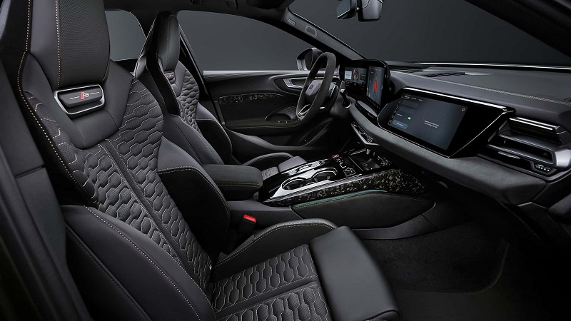 Unutra su promene manje dramatične. I dalje postoji dosta sjajnih crnih ukrasa, trostruki ekran sa debelim okvirima i uobičajene kapacitivne kontrole osetljive na dodir. Audi je osvežio kabinu sedištima koja prianjaju uz telo, sa prošivenim saćastim oblikom, standardnim električnim podešavanjem i funkcijom masaže. Osnovni RS5 nema kožni tapacirung, dok viši nivoi opreme nude izbor crvene ili sive kože. Na drugim mestima, kabina ima volan presvučen kožom, spljošteni na vrhu i dnu, sa RS dugmadima za promenu režima vožnje i aktiviranje funkcije maksimalne isporuke snage, koja traje 10 sekiundi u boost modu. Kontrastni šavovi, crna obloga krova i dekorativni umeci zaokružuju podešavanja.
