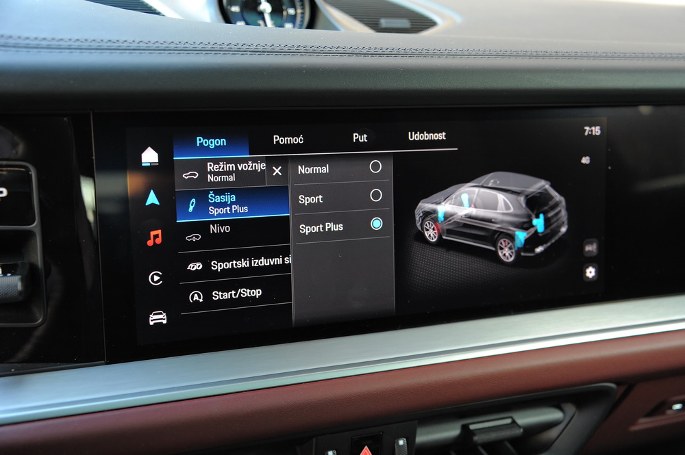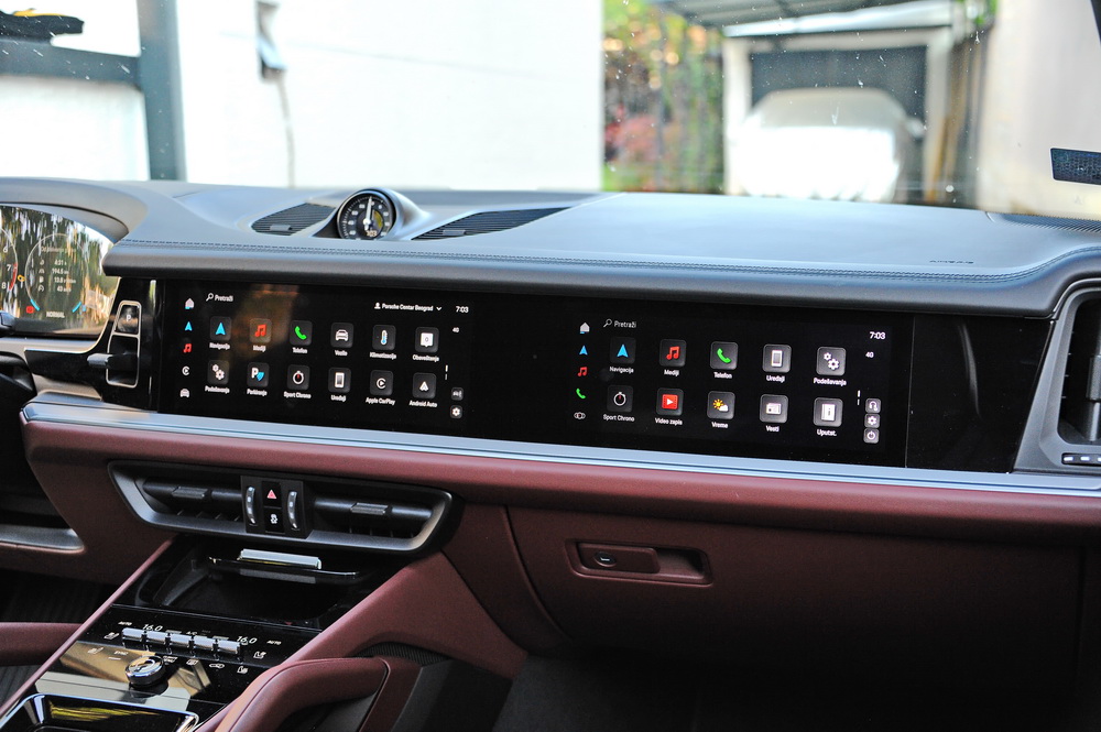 Ni Porsche Cayenne nije zaobišao trend digitalizacije i pretvaranje kabine automobila u bioskop na točkovima. Da, među opcijama ugrađenim u testirano vozilo bio je i famozni i veliki treći ekran za suvozača, koji je dobrim delom ogledalo osnovnog ekrana infotejmenta uz dodatne aplikacije koje može da koristi suvozač, a koji je vrlo efikasno skriven od pogleda vozača, kako ne bi u vožnji došao u iskušenje da pogleda film koji gleda suvozač. Ok, prihvatamo, lepo za imati, zabavno za suvozača, ali ne i nužno neophodno. Ono što nam se definitivno dopada je činjenica da su oba info-zabavna ekrana ugrađena u armaturu, a ne postavljena na nju.